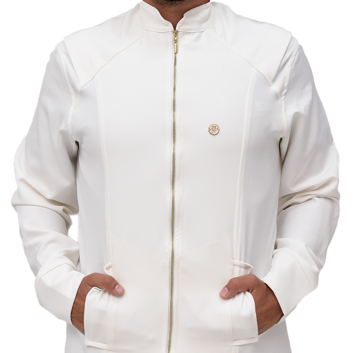 Jaleco Masculino Slim Moratty com Gola Padre, Manga Longa, Frisos nos ombros, Recortes, Punho do próprio tecido, Bolsos Frontais embutido com Pala e fechamento em Zíper central dourado.