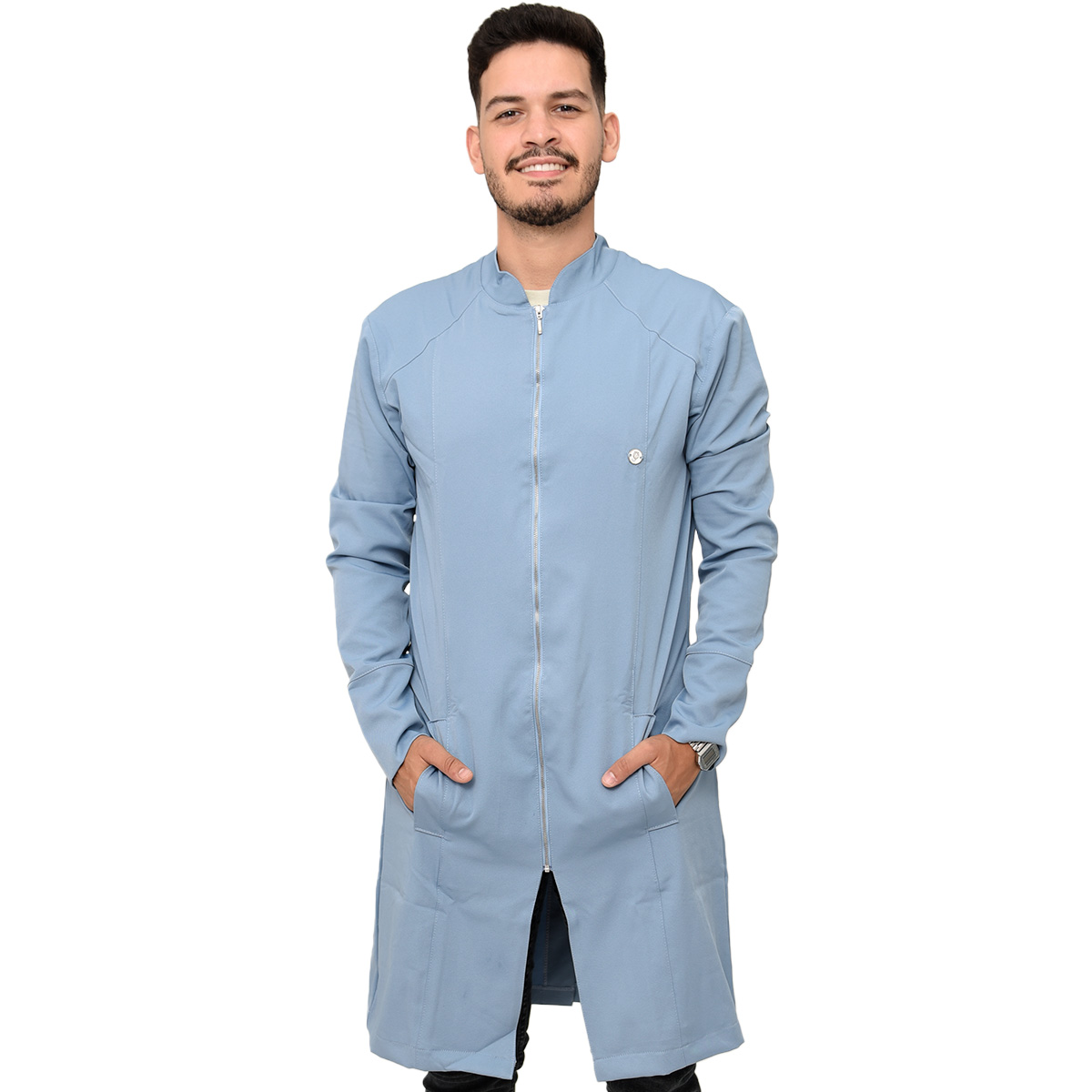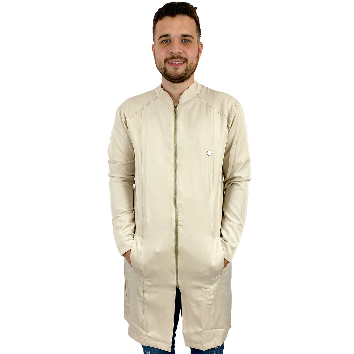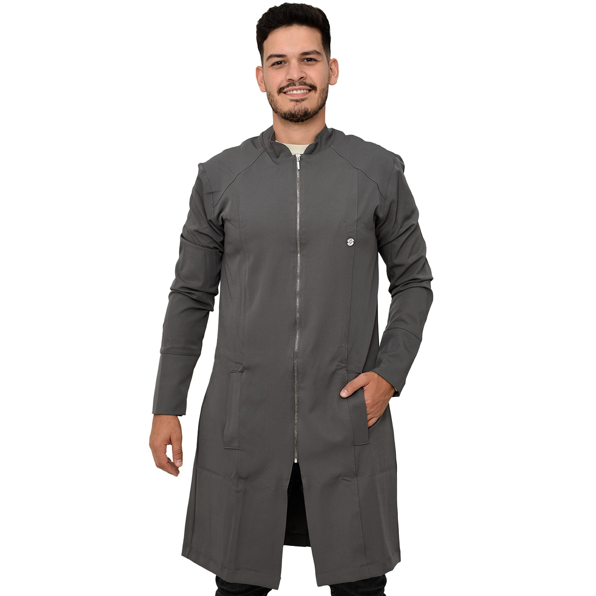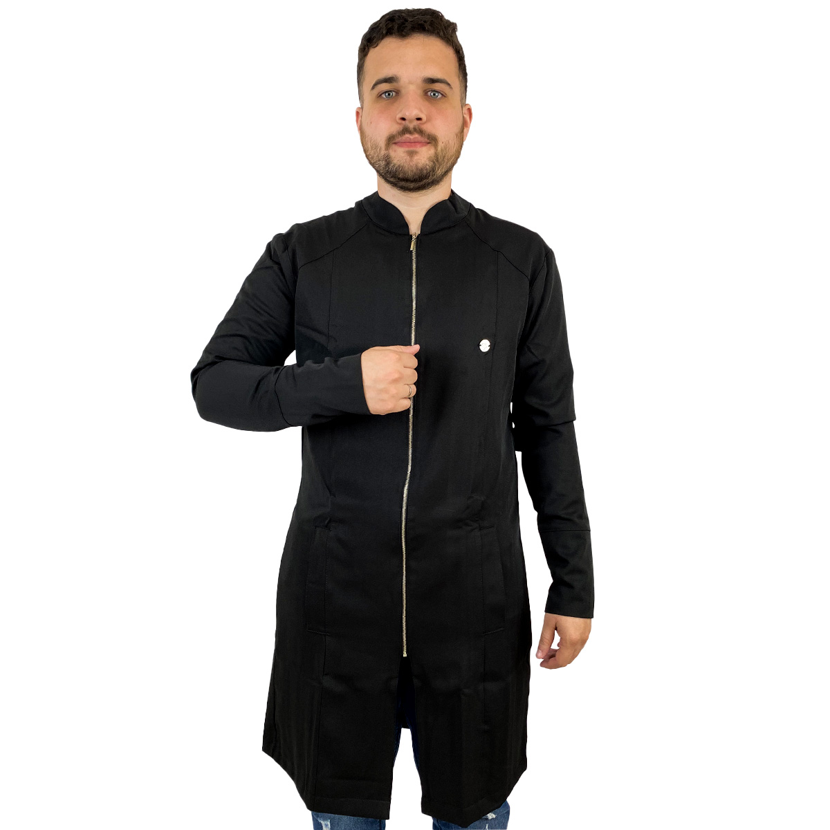 Jaleco Masculino Slim Recortes com Gola Padre, Manga Longa, Punho do próprio tecido, bolsos laterais embutidos, detalhe em recortes (costura), modelo mais comprido e fechamento em Zíper de metal prata.