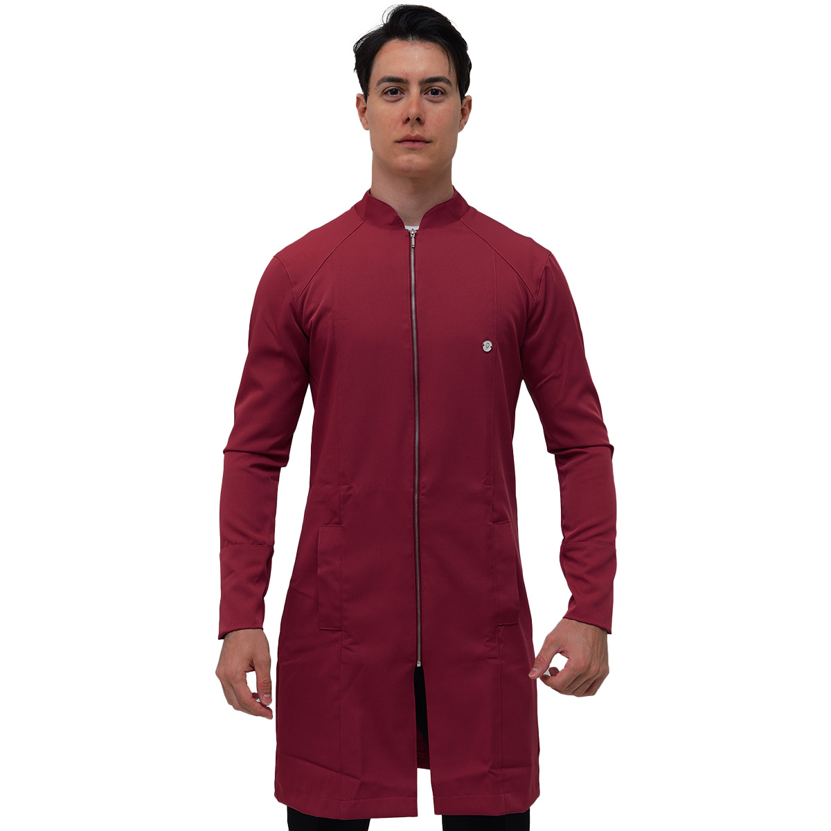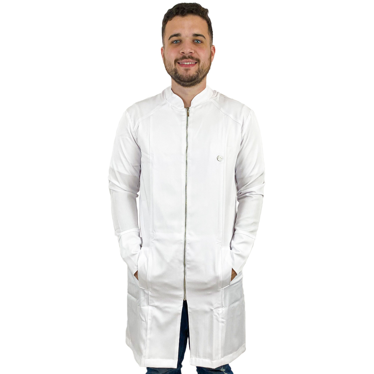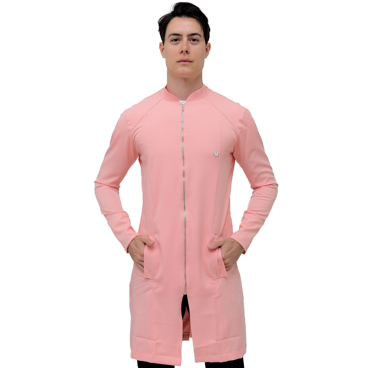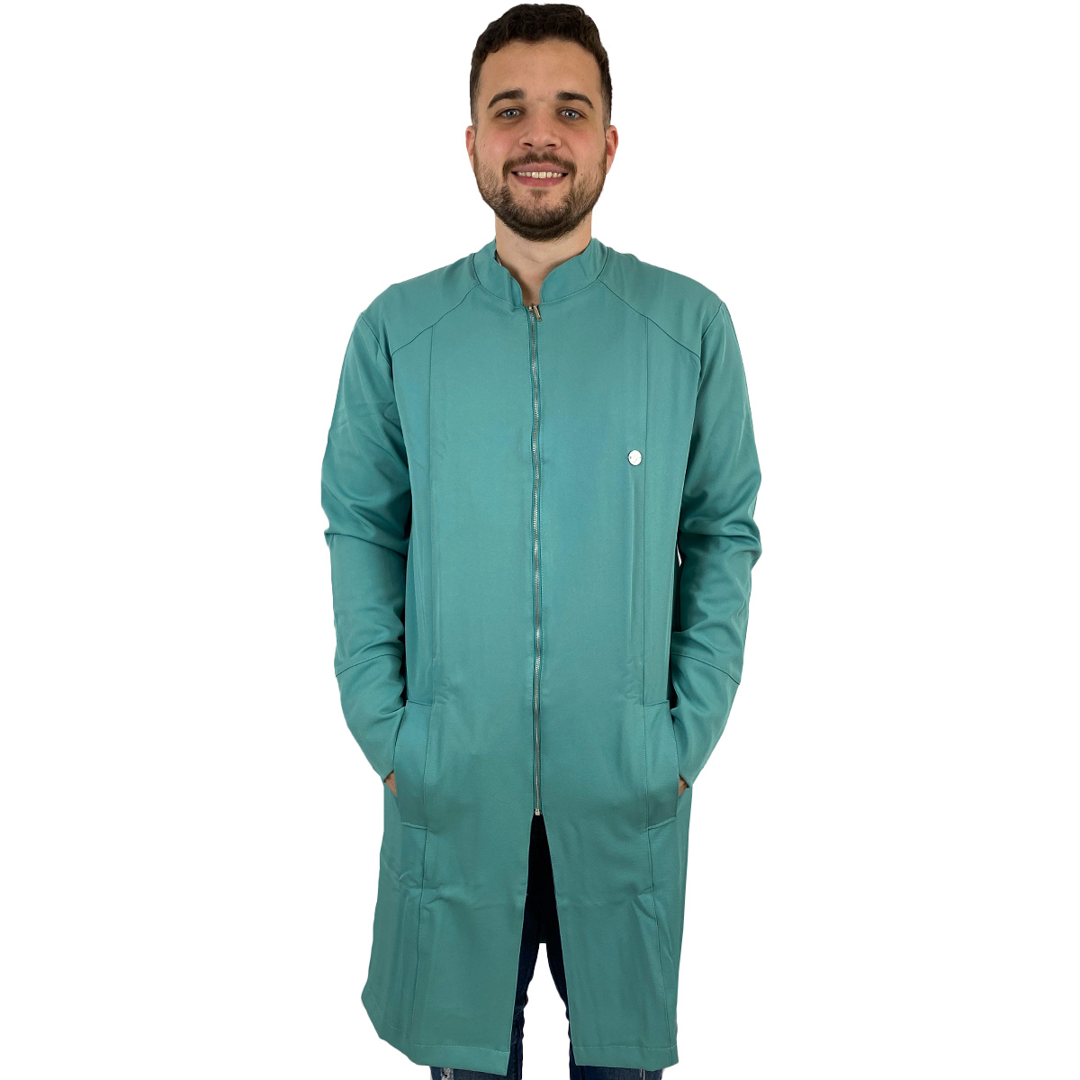Jaleco Masculino Slim Recortes com Gola Padre, Manga Longa, Punho do próprio tecido, bolsos laterais embutidos, detalhe em recortes (costura), modelo mais comprido e fechamento em Zíper de metal prata.